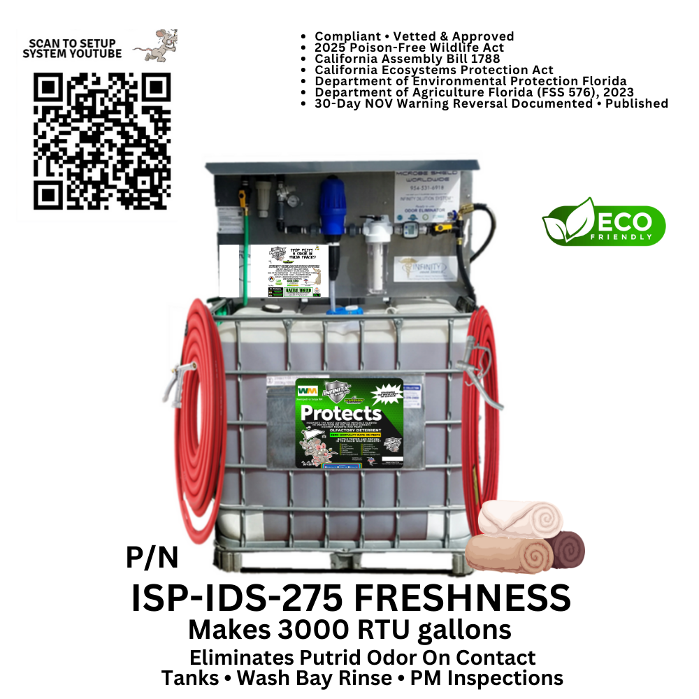 This concentrated 275-gallon tote comes with a dilution system that needs no electricity and uses only water pressure from the spigot. It pumps 14 gallons per minute and lets your trucks fill their odor stands without the hassle of a backed-up fleet waiting to make money! Odor Eliminator & Pest Deterrent • Hyper Green • contains No VOC compounds. Eliminates Odor on Contact. Vetted by the DEP and peer-reviewed for the only product to help your commercial customers. No More musical dumpsters when your driver hits the account. Eliminates Odor and stops pests inside dumpsters. Prevents pest nesting and infestation. Infinity Shields Protects creates a hyper-green, eco-friendly mist that eliminates odor and drives pests away. non slippery finish. Brings No harm to the site, the environment, or human health. The only scientifically developed odor eliminator and olfactory-deterrent that disrupts the odor molecule as well as pest sensory pathways, making the treated area odor-free and pest uninhabitable. Designed specifically for hauling facilities in the solid waste industry, tested and proven since 2015, this odor eliminate forms an invisible barrier of protection on any surface. eliminating the worst putrid odors, enhancing sanitation operations inside the tipping floor, and supporting compliance with modern environmental regulations. Regulatory & Environmental Approval & Compliance: Department of Environmental Ser. 2015 Hydrosphere Research 2016 Industrial Hygiene Resources 2018 Product Safety Labs 2018-2021 Department of Agriculture 2023, Approved for direct application under Florida Dept. of Agriculture FSS 576 Rule 5E, for direct application to bio-compost, leachate, sewage, sludge, and landfill surfaces. 2020 Most Innovative Product of the Year Home Depot. 2020 Top 5 Finalist for Sustainability Home Depot. Complies with the 2025 Poison-Free Wildlife Act, supporting EPA and DPR restrictions on SGARs and FGARs rodent anticoagulants by offering a non-lethal, non-toxic alternative to rodenticides laws. Proven Results Across Waste Management Fleets since 2015: Peer Reviewed and Published 2016 WAM Vol 16 Key Benefits: ✔ Contains No VOC Compounds ✔ Stops odor on contact and prevents pests nesting and pest intrusion ✔ No off-gassing, cab safe ✔ Application rate 500 to 1 ✔ EPA, DPR, SGAR, and FGAR-compliant – Zero pest mortality rate, Contains No Nitrates, No Phosphates, No BODs No CODs. ✔ DOA-approved for direct contact with all waste materials. ✔ Eliminates odor from chicken renderings and sludge on contact. ✔ Sustainable, safe, and free from toxic bait chemicals – Keeps staff safe ✔ Facility safe for inside use |