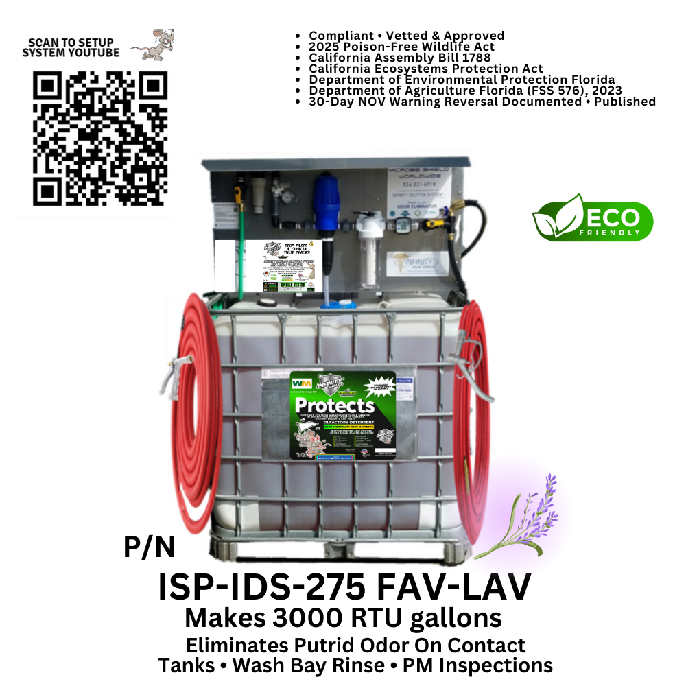 This concentrated 275-gallon tote comes with a dilution system that needs no electricity and uses only water pressure from the spigot. It pumps 14 gallons per minute and lets your trucks fill their odor stands without the hassle of a backed-up fleet waiting to make money! Odor Eliminator & Pest Deterrent • Hyper Green • contains No VOC compounds. Eliminates Odor on Contact. Vetted by the DEP and peer-reviewed for the only product to help your commercial customers. No More musical dumpsters when your driver hits the account. Eliminates Odor and stops pests inside dumpsters. Prevents pest nesting and infestation. Infinity Shields Protects creates a hyper-green, eco-friendly mist that eliminates odor and drives pests away. non slippery finish. Brings No harm to the site, the environment, or human health. The only scientifically developed odor eliminator and olfactory-deterrent that disrupts the odor molecule as well as pest sensory pathways, making the treated area odor-free and pest uninhabitable. Designed specifically for hauling facilities in the solid waste industry, tested and proven since 2015, this odor eliminate forms an invisible barrier of protection on any surface. eliminating the worst putrid odors, enhancing sanitation operations inside the tipping floor, and supporting compliance with modern environmental regulations. Regulatory & Environmental Approval & Compliance: Department of Environmental Ser. 2015 Hydrosphere Research 2016 Industrial Hygiene Resources 2018 Product Safety Labs 2018-2021 Department of Agriculture 2023, Approved for direct application under Florida Dept. of Agriculture FSS 576 Rule 5E, for direct application to bio-compost, leachate, sewage, sludge, and landfill surfaces. 2020 Most Innovative Product of the Year Home Depot. 2020 Top 5 Finalist for Sustainability Home Depot. Complies with the 2025 Poison-Free Wildlife Act, supporting EPA and DPR restrictions on SGARs and FGARs rodent anticoagulants by offering a non-lethal, non-toxic alternative to rodenticides laws. Proven Results Across Waste Management Fleets since 2015: Peer Reviewed and Published 2016 WAM Vol 16 Key Benefits: ✔ Contains No VOC Compounds ✔ Stops odor on contact and prevents pests nesting and pest intrusion ✔ No off-gassing, cab safe ✔ Application rate 500 to 1 ✔ EPA, DPR, SGAR, and FGAR-compliant – Zero pest mortality rate, Contains No Nitrates, No Phosphates, No BODs No CODs. ✔ DOA-approved for direct contact with all waste materials. ✔ Eliminates odor from chicken renderings and sludge on contact. ✔ Sustainable, safe, and free from toxic bait chemicals – Keeps staff safe ✔ Facility safe for inside use |