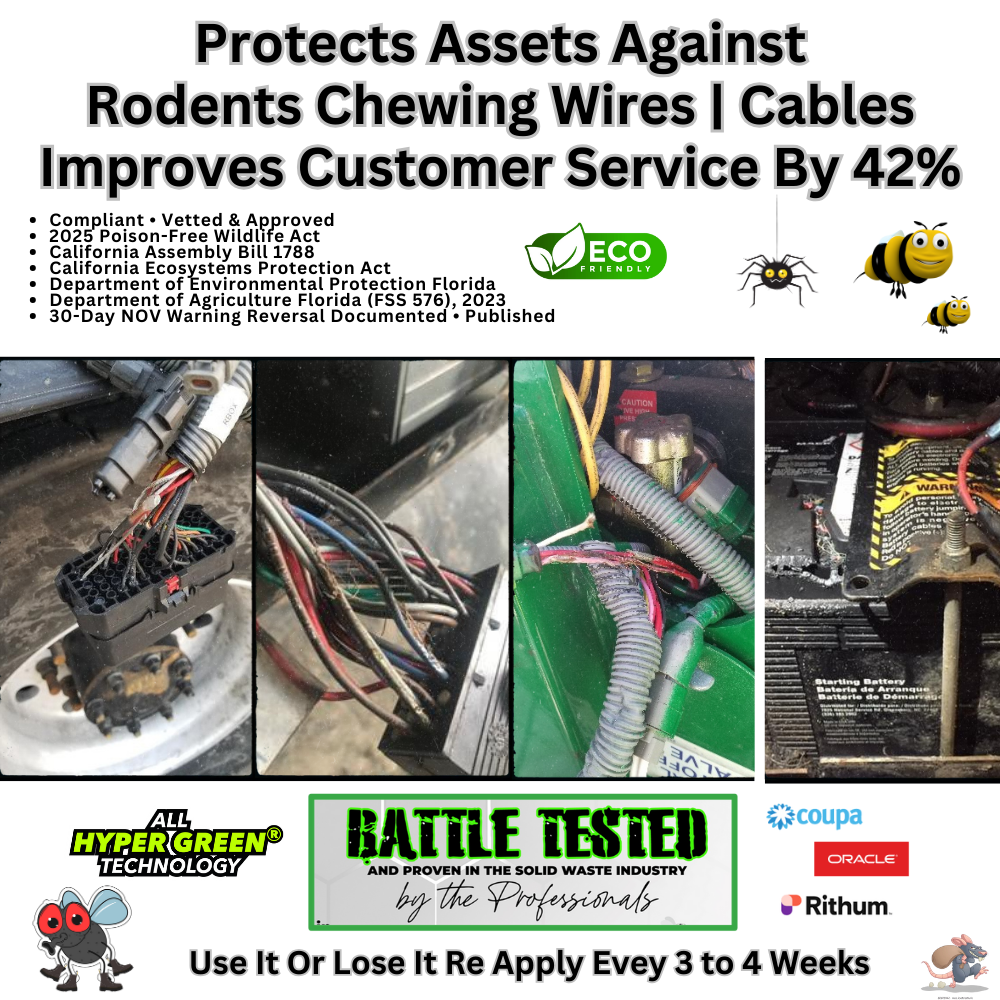 Infinity Shields Protects® is a Hyper Green Rodent and Pest Deterrent that stops rodents and varmints in their tracks and prevents chewing, nesting, and loitering. Once on the treated surface, Infinity Shields Protects creates an invisible barrier on fabric, textiles, and all hard surfaces. Prevents damage to treated items wires, cables, harnesses, plastic, engine parts, fabric, textiles, and metal. Eliminates the worst odor on contact too. Infinity Shields Protects® has a zero-mortality rate and will not harm pests. Infinity Shields Protects® has no health-bearing kill claims. Use indoors or outdoors, pro-actively or re-actively, to keep rodents, varmints, and pests away without harm. Made in America by Combat Veterans.